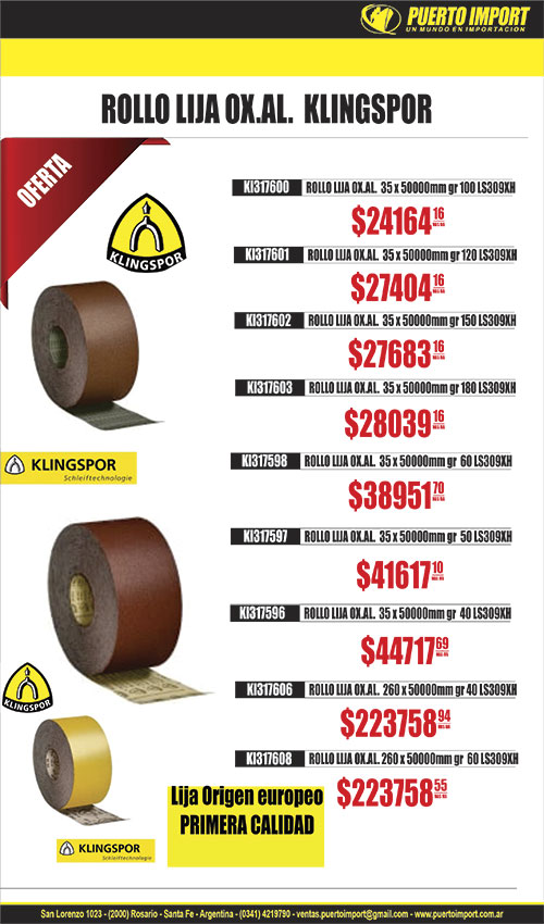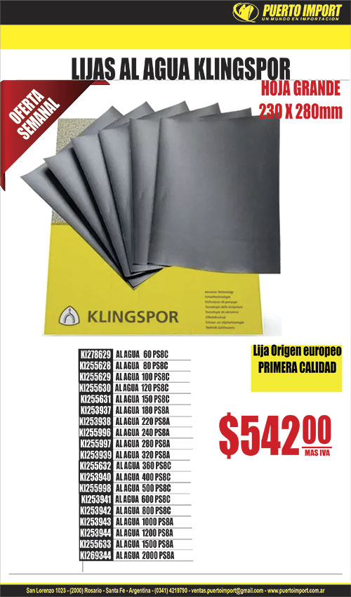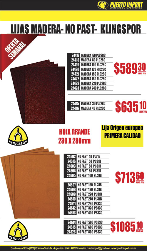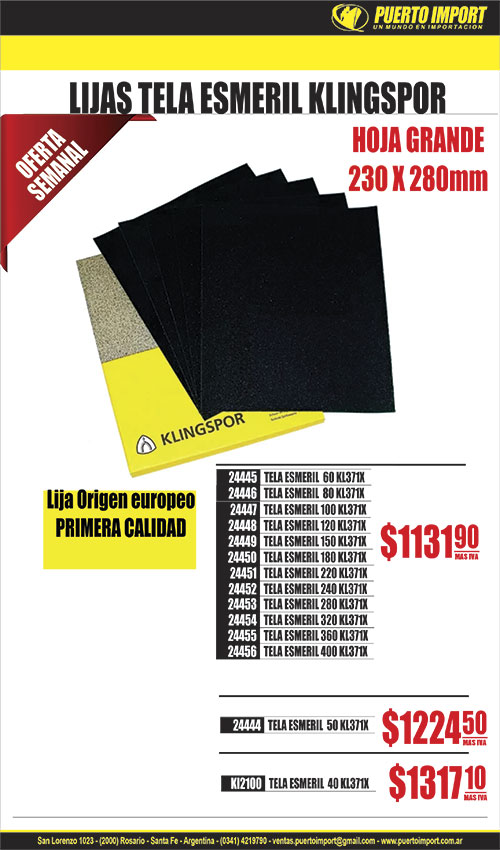 ![]() BOQUILLA ATORN. MAG.CrV. CONER 5914 1/4"x65mm ![]() ![]() BRAZO LLUVIA 90° acero inox. MOZART 27692 50cm 9072 ![]() ![]() CANILLA BCE.C/MANGA 11780 1/2" GIMP![]() ![]() CASCO SEGURIDAD C/ARNES MILENIUM LIBUS 16426 AMARILLO ![]() 19736 CHOCLA GRANDE![]() CINTA METRICA AGRIM.TIPO REEL FIBRA 17279 20m 17280 30m 17282 100m ![]() ![]() 6103 CORTAVIDRIO C/ACEITE T/SILBERTSNICH TOOLMAK![]() 6600 CUTTER HOJA CHICA CORREDEARA METAL REF![]() DISCO FLAP 4 1/2" ZIRCONIO NORTON 32532 60 ![]() ![]() DISCO LIJA VELCRO OX.AL.125mm RUHLMANN 25932 gr 40 25933 gr 60 ![]() 75 FICHA ELEC.HEMBRA C/NEUTRO 10A AXIAL NEGRA C/PRENSACABLE![]() ![]() FRATACHO ABRASIVO ABRASOL 2956 FINO 2957 GRUESO ![]() ![]() 28002 GRIF.BIDET MONO.MADERA ABS S/TRANS 7243 MOZART![]() ![]() 27938 GRIF.DUCHA MONO.ESCALA NEGRA C/TRANSF/DUCHAD GIMP![]() ![]() 27887 GRIF.LAVA.MONO.ABS BOGOTA CIL.V/PLANO CROM. 7166 MOZART![]() ![]() 27904 GRIF.LAVA.MONO.ABS CIL.V/PLANO NEGRA 9911 MOZART![]() ![]() 27859 GRIF.LAVA.MONO.CASCADA VIDRIO REDONDA 9580 MOZART![]() ![]() 28161 GRIF.LAVA.MONO.FOX CROMADA GIMP![]() ![]() 27862 GRIF.LAVA.MONO.MADRID CILIN.V/PLANO 9038 MOZART![]() ![]() 28162 GRIF.LAVA.MONO.PIPERS CROMADA GIMP![]() ![]() 27884 GRIF.MESA.MONO.ABS DOHA BRA.MOVIL PICO J NEGRA 7221 MOZART![]() ![]() 28105 GRIF.MESA.MONO.FENIX NEGRA ROCIADOR EXTRAIBLE GIMP![]() ![]() 27837 GRIF.MESA.MONO.PRAGA BRA.MOVIL PICO BAR ACERO 7198 MOZART![]() ![]() 27974 GRIF.MESA/LAVA.MEZCL.BROOKLYN PICO BAR NEGRA 7077 MOZART![]() ![]() 27840 GRIF.PARED MONO.ABS BRA.MOVIL PICO J BLANCA 7152 MOZART![]() ![]() 18542 GRIF.PARED UN AGUA METAL BRAZO MOVIL PICO CISNE 9019 MOZART![]() 12097 HOJA SIERRA MONTARAZ 21" MAD BISON![]() ![]() 25137 LENTE ARGON FUV/ANRAYA CLARO LIBUS![]() ![]() 24242 LENTE DISCOVERY FLEX ANTIEMP/FUV/ANRAYA CLARO STEELPRO![]() ![]() 24266 LENTE GRAVITY FUV/ANRAYA CLARO STEELPRO![]() 24290 LENTE PATILLA REGULABLE CLARO![]() ![]() 24238 LENTE RUNER ANTIEMP/FUV/ANRAYA CLARO STEELPRO![]() ![]() 24239 LENTE XT ANTIEMP/FUV/ANRAYA CLARO STEELPRO | ![]() BOTA GOMA IND. CAMPERA NEGRA TECNOBOOT 27050 T 38 27051 T 39 27052 T 40 27054 T 42 27055 T 43 27056 T 44/45 ![]() CANDADO BCEADO. ROCK TOOLS 16140 25mm 16143 32mm 16148 75mm ![]() ![]() CANILLA ESFER.METAL C/MANGA MOZART 16194 3/4" 9453 ![]() 20716 CHALECO REFLECTIVO REJILLA AMARILLO XXL![]() 1723 CINTA METRICA 1 MT![]() CONCERTINA PERIMETRAL doble cruzada 581 30cm 55vuelta cubre 7m580 45cm 55vuelta cubre 10m![]() 4884 CUTTER HOJA CHICA![]() 25455 DEST.INTERC.PHILIPS/PLANO REG.REF.ERG PH2x150mm![]() ![]() DISCO LIJA VELCRO NO PAST 125mm RUHLMANN 40024 gr 240 RU91104 40025 gr 320 RU91105 ![]() 21813 ESCAREADOR P/USO CON PISTOLA DE PINTAR![]() 26483 FICHA ELEC.MACHO C/NEUTRO 10A AXIAL NEGRA![]() 11988 FUELLE CONEC. INODORO A MOCHILA CORTO 2"![]() ![]() 27929 GRIF.BIDET MONO.DOHA NEGRA C/TRANS COMPL 7420 MOZART![]() ![]() 29875 GRIF.DUCHA EXT.MONO.5 PIEZAS C/TRANSF/DUCHADOR GIMP![]() ![]() 27858 GRIF.LAVA.MONO.ABS BOGOTA CIL.V/PLANO BLANCA 9374 MOZART![]() ![]() 29895 GRIF.LAVA.MONO.ABS BOMFIO CIL.V/PLANO BLANCA GIMP![]() ![]() 27889 GRIF.LAVA.MONO.ABS PHONEIX CIL.V/PLANO CROMO 7146 MOZART![]() ![]() 27760 GRIF.LAVA.MONO.DAKAR CILIND.V/PLANO ALTA 240mm 9539 MOZART![]() ![]() 27903 GRIF.LAVA.MONO.MADRID CILIN.V/PALITO ACERO ALTA 9339 MOZART![]() ![]() 27899 GRIF.LAVA.MONO.MADRID CILIN.V/PLANO NEGRA ALTA 9239 MOZART![]() ![]() 28012 GRIF.LAVA.MONO.VECTRA GIMP![]() ![]() 28107 GRIF.MESA.MONO.EMPIRE ROCIA.EXTR.DOB PICO NEGRA GIMP![]() ![]() 28053 GRIF.MESA.MONO.PERSA NEGRA BRA.MOVIL CISNE GIMP![]() ![]() 27991 GRIF.MESA.MONO.TOKIO NEGRA BRA.MOVIL PICO GIRA L 7353 MOZART![]() ![]() 8992 GRIF.PARED MEZCL.V/CRUZ C/COMPRE. C/BRAZO L 9579 MOZART![]() ![]() 28111 GRIF.PARED MONO.BULL NEGRA BRA.FLEXIBLE CONO GIMP![]() 13790 GUANTE PU NYLON TEJIDO NEGRO T10![]() ![]() 10035 LAPIZ PUNTA DE WIDIA TOOLMAK![]() ![]() 24286 LENTE DESERT ANTIEMP/FUV/ANRAYA ANGUL. CLARO STEELPRO![]() ![]() 28027 LENTE ECOLINE FUV/ANRAYA OSCURO LIBUS![]() ![]() 24338 LENTE OMEGA ANTIEMP/FUV/ANRAYA P/OPTICO CLARO STEELPRO![]() ![]() 24241 LENTE PATROL ANTIEMP/FUV/ANRAYA CLARO STEELPRO![]() ![]() 24276 LENTE SPY FUV/ANRAYA OSCURO STEELPRO | ![]() ![]() BRAZO LLUVIA 45° acero inox. MOZART 27694 25cm 8705 ![]() 14680 CALIBRE DIGITAL PLASTICO 150mm![]() 16603 CANDADO BCEADO. 20mm TRICIRKAL![]() ![]() 26098 CANILLA ESFER.PLAST.C/MANGA 1/2" GIMP![]() 18909 CHALECO REFLECTIVO REJILLA NARANJA XXL![]() CINTA METRICA AGRIM.CAJA CERRADA FIBRA 17276 20m 17277 30m 17290 100m ![]() 582 CONCERTINA PERIMETRAL 30cm simple cruzada 40vuelta cubre 10![]() 6137 CUTTER HOJA CHICA CHAPA REF![]() ![]() DISCO FLAP 4 1/2" ZIRC. KLINGSPOR 24403 36 CONV. SMT624 SUPRA 24404 40 CONV. SMT624 SUPRA 24405 50 CONV. SMT624 SUPRA 25228 120 CONV. SMT325 EXTRA 24408 120 CONV. SMT624 SUPRA 25232 120 PLANO SMT325 EXTRA 24115 120 PLANO SMT618 EXTRA 24542 120 PLANO SMT625 SUPRA ![]() FAJA LUMBAR 4 BALLENAS 25463 T5 XXXL![]() 76 FICHA ELEC.MACHO C/NEUTRO 10A AXIAL NEGRA C/PRENSACABLE![]() GRAMPA ENGRAMP. MANUAL LIV 18446 11.3x0.7x 4mm x 100014770 11.3x0.7x14mm x 1000![]() ![]() 29881 GRIF.DUCHA EXT.MONO.5 PIEZAS C/TRANSF/DUCHADOR C/GOLPE GIMP![]() ![]() 29882 GRIF.DUCHA MONO.MANHATTAN S/TRANSF/DUCHAD 9485 MOZART![]() ![]() 27886 GRIF.LAVA.MONO.ABS BOGOTA CIL.V/PLANO NEGRA 7164 MOZART![]() ![]() 27854 GRIF.LAVA.MONO.ABS PHOENIX CIL.V/PLANO BLANCA 7144 MOZART![]() ![]() 28119 GRIF.LAVA.MONO.CILOPE CILINDRO V/PLANO ALTA GIMP![]() ![]() 28110 GRIF.LAVA.MONO.FOX NEGRA GIMP![]() ![]() 27861 GRIF.LAVA.MONO.MADRID CILIN.V/PLANO ALTA 9039 MOZART![]() ![]() 28115 GRIF.LAVA.MONO.TUBE CILINDRO V/PALITO GIMP![]() ![]() 28108 GRIF.MESA.MONO.BRONX C/PUENTE Y RESORTE NEGRA GIMP![]() ![]() GRIF.MESA.MONO.MOURA BRA.FLEXIBLE 28016 AMARILLA GIMP![]() ![]() 27838 GRIF.MESA.MONO.TOKIO ACERO BRA.MOVIL PICO GIRA L 7193 MOZART![]() ![]() 28112 GRIF.MESA/LAVA.MONO.NIAGARA PICO PLANO NEGRA GIMP![]() ![]() 27853 GRIF.PARED MONO.ABS BRA.MOVIL PICO J NEGRA 7153 MOZART![]() 220 GUANTE DESCARNE GRIS Y JEAN![